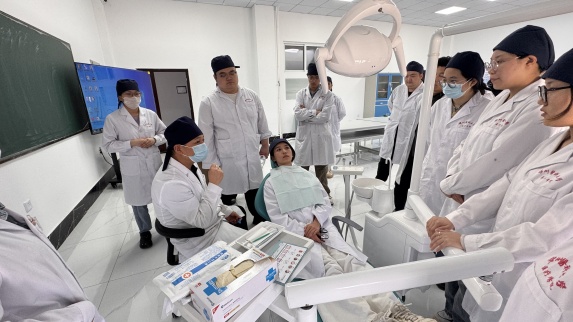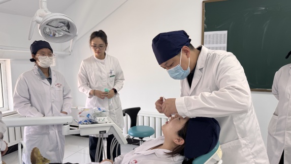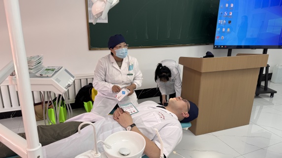 之后由正畸医学中心团队的医生教授学生进行口腔健康检查。口腔检查是医生的必备技能,在老师的细致指导下,在师生间的互动中,学生既掌握了口腔检查的基本技能,也了解了自己口腔存在的问题。
