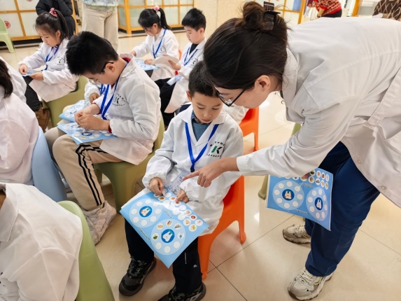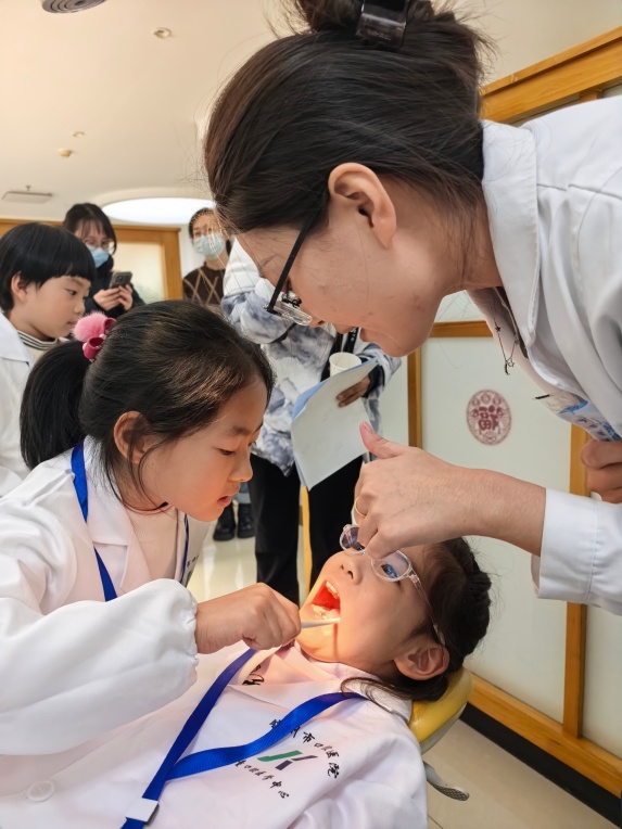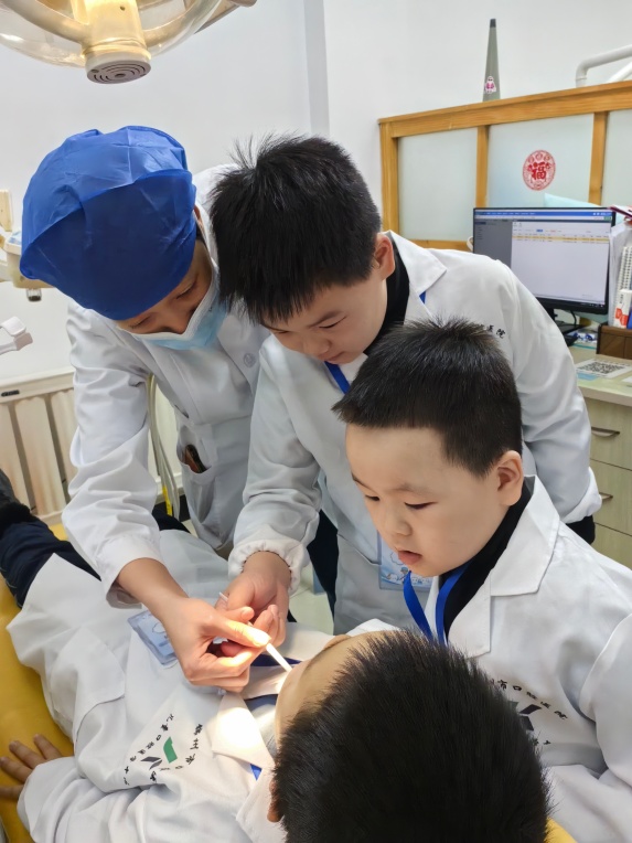 本次体验营的高光时刻,当属小牙医职业角色扮演环节。在专业医生的全程指导下,孩子们两人一组结对配合,轮流扮演牙医与小患者,手持口镜互相检查口腔状况,有模有样地完成问诊、查看、叮嘱全流程。“原来当牙医这么有意思!”参与体验的小朋友兴奋地分享感受。通过角色互换,孩子们不仅直观了解了牙医的日常工作,更在亲身体验中彻底消除了对牙科检查、治疗的恐惧,建立起对口腔诊疗的正向认知。