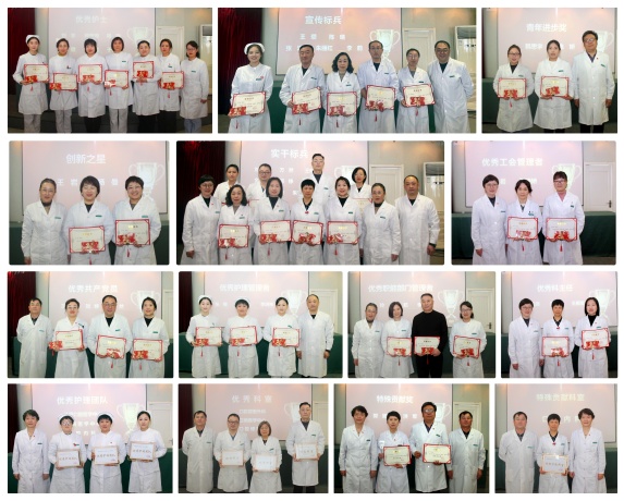 伴随着十四个奖项情真意切、各具特色的颁奖词的逐一宣读,获得“优秀护士奖”、“宣传标兵奖”、“青年进步奖”、“创新之星奖”、“实干标兵奖”、“优秀工会管理者奖”、“优秀共产党员奖”、“优秀护理管理者奖”、“优秀职能部门管理者奖”、“优秀科主任奖”、“优秀护理团队奖”、“优秀科室奖”、“特殊贡献奖”、“特殊贡献科室奖”的获奖集体和个人代表依次登台领奖,接受属于他们的荣誉与掌声。